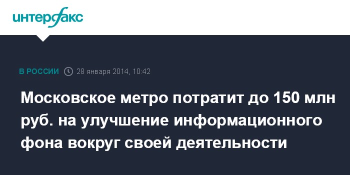 Москва. 28 января. INTERFAX.RU - ГУП "Московский метрополитен" объявил конкурс на создание системы информационного реагирования и реализации комплексной программы мер по улучшению информационного фона вокруг деятельности московского метро.