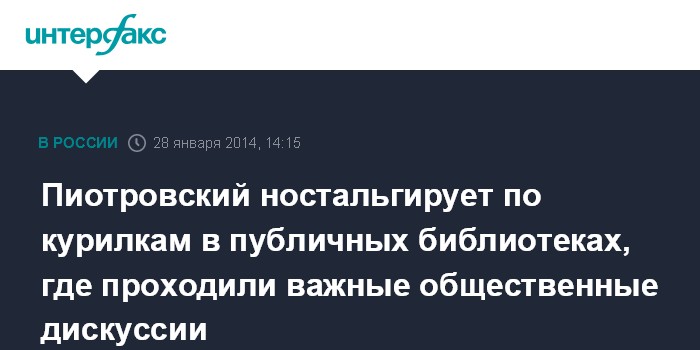 Санкт-Петербург. 28 января. INTERFAX.RU - Директор Государственного Эрмитажа Михаил Пиотровский с ностальгией отозвался о временах, когда в российских публичных библиотеках были курилки.