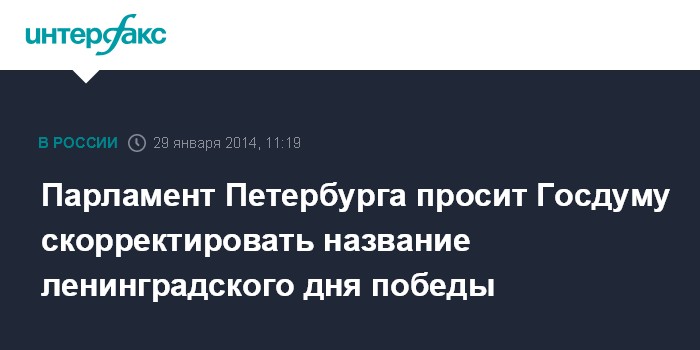 Санкт-Петербург.. 29 января. INTERFAX.RU - Законодательное собрание Петербурга обратилось к Госдуме с просьбой изменить официальное название ленинградского дня победы на "День полного освобождения Ленинграда от фашистской блокады", передал корреспондент "Интерфакса".