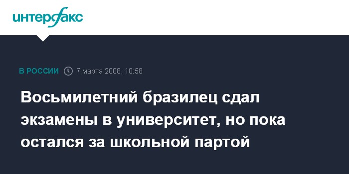 Бразилиа. 7 марта. INTERFAX.RU- Мальчик, возраст которого всего восемь лет, сумел сдать вступительные экзамены в один из частных бразильских университетов, сообщают в пятницу местные СМИ.