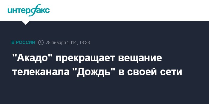 Москва. 29 января. INTERFAX.RU - Руководство группы компаний ""АКАДО" решило приостановить использование лицензии на трансляцию в своей телевизионной кабельной сети телеканала "Дождь" с 30 января, говорится в сообщении "Акадо".