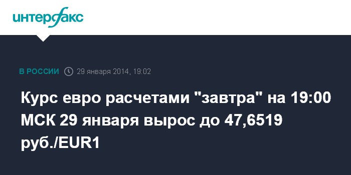 Москва. 29 января. INTERFAX.RU - Средневзвешенный курс евро расчетами "завтра" на единой торговой сессии (ЕТС) Московской биржи в среду по данным на 19:00 МСК вырос на 39,84 копейки по сравнению с результатом предыдущих торгов и составил 47,6519 руб./EUR1.