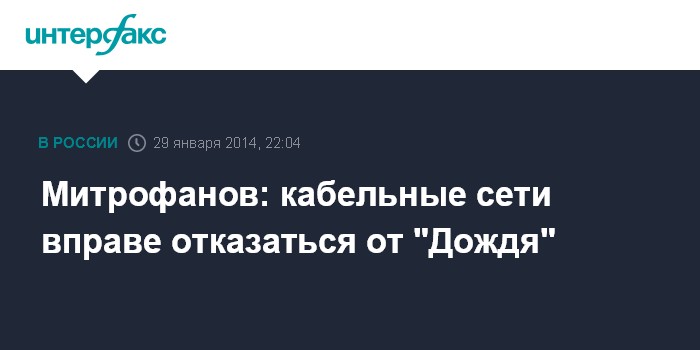 "Это - медийный скандал, и как мне кажется, отказ от вещания "Дождя" - это в некотором смысле эмоциональное решение, связанное с определенным риском", - сказал Митрофанов "Интерфаксу" в среду, комментируя сообщения о прекращении компанией "АКАДО" вещания "Дождя" с 30 января. Аналогичное решение было принято оператором спутникового телевидения "НТВ Плюс".