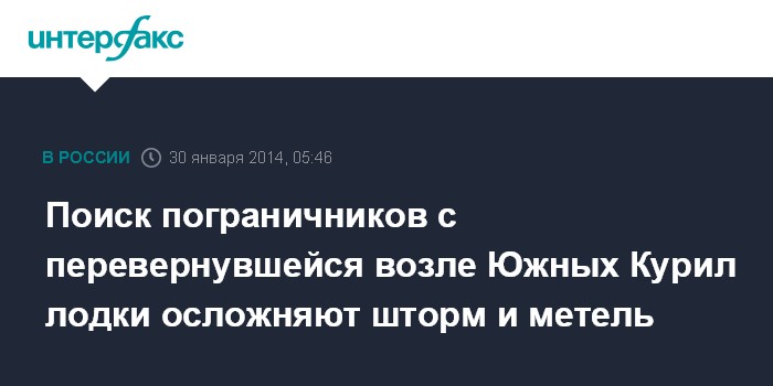 Москва. 30 января. INTERFAX.RU - Поиски пограничников с перевернувшейся 24 января возле Южных Курил лодки в четверг продолжаются только на берегу из-за плохих погодных условий, сообщили агентству "Интерфакс-Дальний Восток" в группе общественных связей Сахалинского погрануправления береговой охраны (СПУБО) ФСБ РФ.