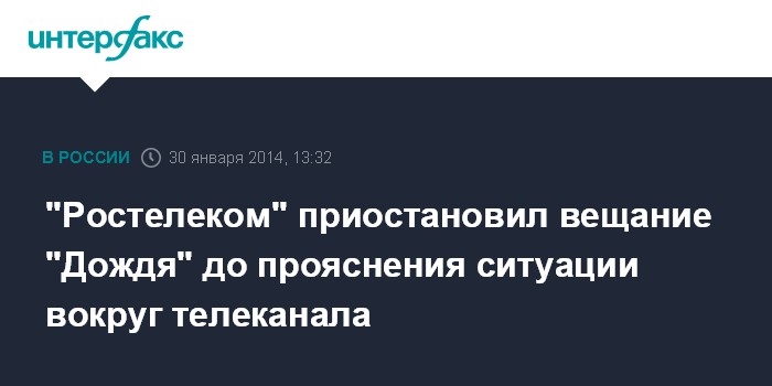 Москва. 30 января. INTERFAX.RU - Телекоммуникационный оператор "Ростелеком" приостановил вещание телеканала "Дождь", сообщил "Интерфаксу" представитель оператора Валерий Костарев.
