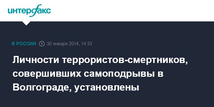 Москва. 30 января. INTERFAX.RU - Правоохранительные органы установили личности двух террористов-смертников, которые совершили террористический акт в конце декабря прошлого года в Волгограде.