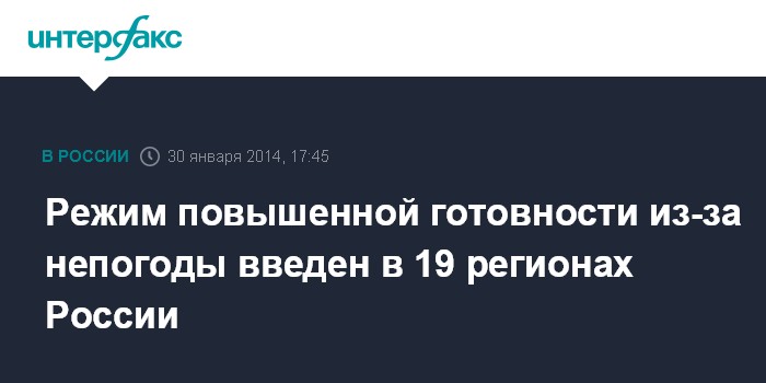 Москва. 30 января. INTERFAX.RU - В связи с неблагоприятными погодными условиями на территории 19 субъектов РФ введен режим повышенной готовности, сообщил глава МЧС России Владимир Пучков.