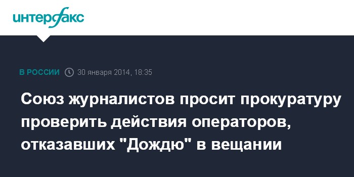 Москва. 30 января. INTERFAX.RU - Союз журналистов России (СЖР) просит прокуратуру проверить действия операторов связи, прекративших вещание телеканала "Дождь".