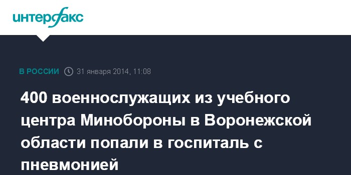 Москва. 31 января. INTERFAX.RU - По результатам прокурорской проверки в одном из военных учебных центров в Воронежской области, где около 400 солдат заболели пневмонией, а один из них скончался, возбуждено уголовное дело, сообщили "Интерфаксу" в Главной военной прокуратуре в пятницу.