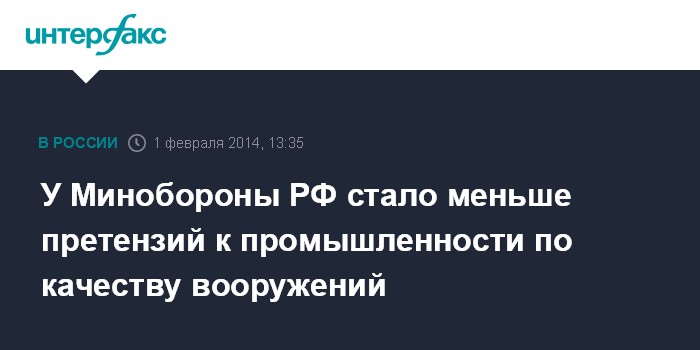 Москва. 1 февраля. INTERFAX.RU - Качество поставляемой в войска военной продукции за последние три года стабилизировалось и наметились тенденции к его улучшению, сообщил начальник управления военных представительств Минобороны РФ Олег Степанов. "Если в 2011-2012 годах у нас приходилась одна рекламация на десять гарантийных изделий, то в 2013 году одна рекламация приходится на 14 гарантийных изделий, что напрямую подтверждает некую положительную динамику", - сказал О.Степанов в эфире радиостанции "Эхо Москвы" в субботу.