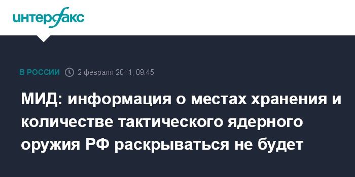 Москва. 2 февраля. INTERFAX.RU - Россия не намерена раскрывать места хранения своего тактического ядерного оружия и информацию о его количестве, заявил директор департамента МИД РФ по вопросам безопасности и разоружения Михаил Ульянов. "Да, нам предлагают предпринять какие-то меры доверия, раскрыв места хранения оружия и его количество. Но кому будет легче, если мы раскроем такую информацию? Разве только террористам. Нужно ли создавать проблемы там, где их пока нет?" - сказал он в интервью "Интерфаксу".