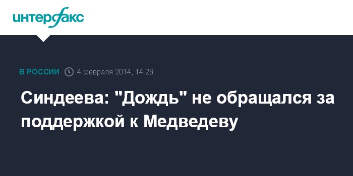 "Мы не обращались. И Дмитрий Медведев, наверное, можно так сказать, он нас поддерживал тем, что он приглашал нас, нашего главного редактора на все свои интервью и для нас это была невероятная поддержка, потому что такого никогда не было, когда четыре федеральных канала берут интервью у президента, а потом и премьера (Медведева. - ИФ) и приглашают, в общем-то, не эфирный - кабельный канал, не с очень большой аудиторией", - заявила Синдеева, отвечая на соответствующий вопрос одного из иностранных журналистов.