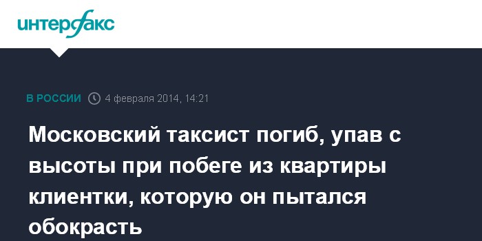 Москва. 4 февраля. INTERFAX.RU - Таксист погиб, упав с высоты во время побега из квартиры клиентки, которую он пытался обокрасть на северо-востоке столицы, сообщил "Интерфаксу" источник в правоохранительных органах, сославшись на предварительные данные расследования.