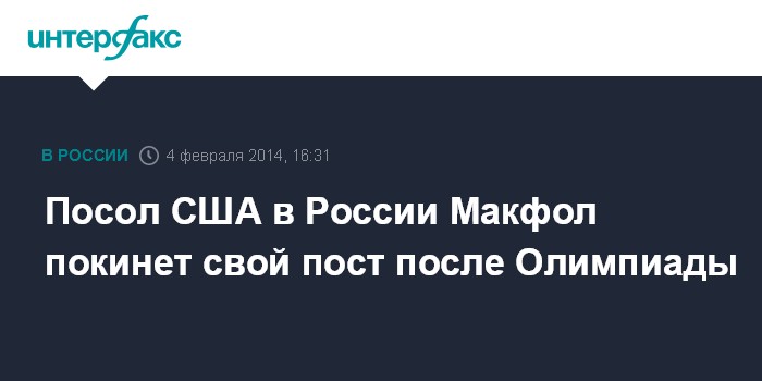 Москва. 4 февраля. INTERFAX.RU - Посол США в Москве Майкл Макфол сообщил, что покидает свой пост после завершения Олимпийских игр в Сочи.