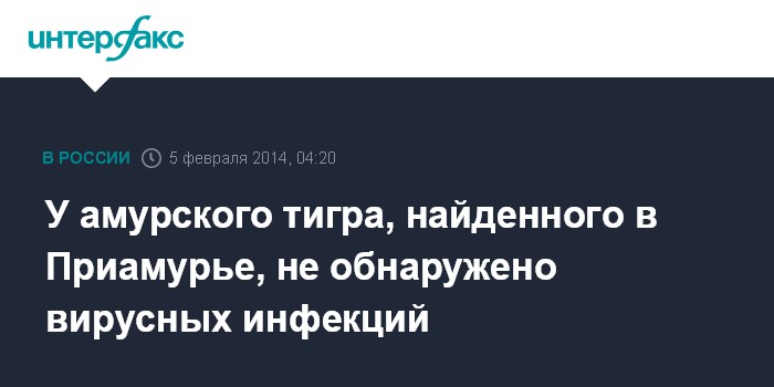 Москва. 5 февраля. INTERFAX.RU - Анализы, взятые у спасенного в тайге Приамурья тигра, не показали наличия у животного инфекционных заболеваний, сообщает сайт Минприроды РФ в среду.