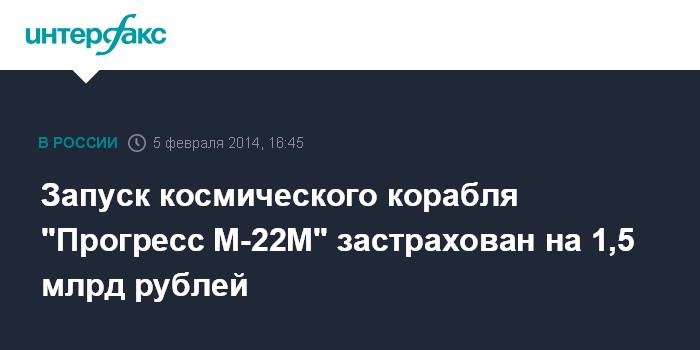 Москва. 5 февраля. INTERFAX.RU - Запуск космического транспортного грузового корабля "Прогресс М-22М" застрахован на 1,518 млрд рублей, говорится в сообщении "Согаза".