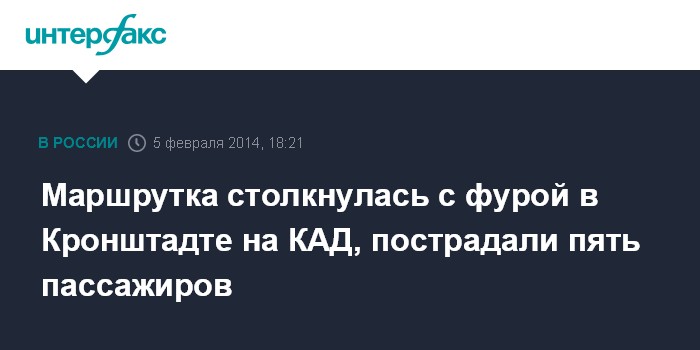 Санкт-Петербург. 5 февраля. INTERFAX.RU - В Кронштадтском районе Санкт-Петербурга в результате столкновения маршрутного автобуса и фуры пострадали пять человек. Один из них - в тяжелом состоянии. Детей среди пострадавших нет.