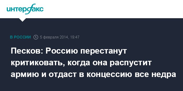 Песков: Россию перестанут критиковать, когда она распустит армию и отдаст в концессию все недра