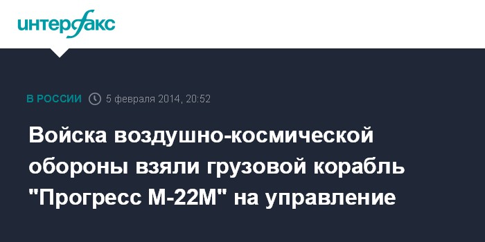 Москва. 5 февраля. INTERFAX.RU - Войска воздушно-космической обороны (ВКО) средствами наземного автоматизированного комплекса управления обеспечили контроль проведения пуска ракеты-носителя "Союз-У" с грузовым космическим кораблем "Прогресс М-22М", сообщил "Интерфаксу" представитель Управления пресс-службы и информации Минобороны России по войскам ВКО полковник Алексей Золотухин.