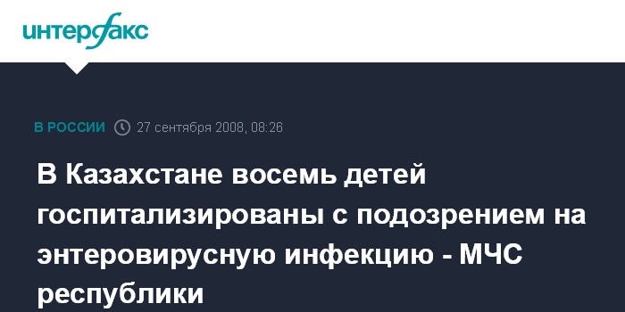 Астана. 27 сентября. ИНТЕРФАКС-КАЗАХСТАН - В Талдыкоргане (адмцентр Алматинской области Казахстана) с подозрением на энтеровирусную инфекцию госпитализированы восемь детей, сообщили в субботу в МЧС республики.