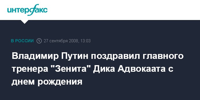 Москва. 27 сентября. INTERFAX.RU - Премьер-министр РФ Владимир Путин встретился в субботу с главным тренером петербургского футбольного клуба "Зенит" Диком Адвокаатом.