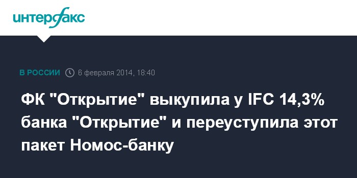 Москва. 6 февраля. INTERFAX.RU - Финансовая корпорация "Открытие" выкупила у Международной финансовой корпорации (IFC) 14,3% акций банка "Открытие" и переуступила его Номос-банку, сообщил агентству "Интерфакс-АФИ" источник на финансовом рынке. Цена обеих сделок одинакова и составляет 4,235 млрд рублей.