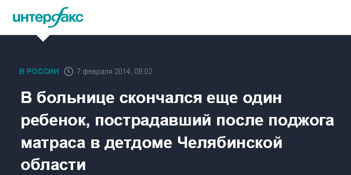 Челябинск. 7 февраля. INTERFAX.RU - Число детей, погибших на пожаре в частном доме города Южноуральска Челябинской области, увеличилось до двух: накануне в реанимационном отделении лечебного учреждения скончалась четырехлетняя девочка