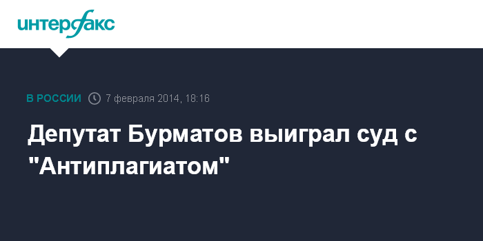 "Суд полностью признал нашу правоту. Мы выиграли этот суд по всем пунктам. В результате "Антиплагиат" не то что не получит сумму иска 10 млн рублей, но, скорее всего, они сами будут должны весьма крупную сумму, поскольку суд продолжался 9 месяцев и сейчас юристы будут высчитывать судебные издержки", - говорится в заявлении Бурматова, опубликованном на сайте "Единой России".
