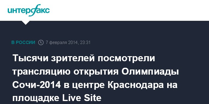 Москва. 7 февраля. INTERFAX.RU - Зрителями церемонии открытия зимней Олимпиады в Сочи на площадке активности болельщиков Live Site Sochi 2014 в Краснодаре в пятницу вечером стали более 4 тыс. человек, сообщил агентству "Интерфакс-Юг" начальник городского управления по физической культуре и спорту Андрей Брижак.