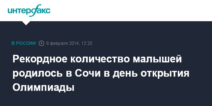 Москва. 8 февраля. INTERFAX.RU - В перинатальном центре Сочи в день открытия XXII Олимпийских зимних игр 2014 года появились на свет 34 младенца. "В день открытия Олимпийских зимних игр в перинатальном центре родились 24 мальчика и 10 девочек. Это рекордное количество суточных рождений малышей за последние 10 лет", - сообщила агентству "Интерфакс-Юг" главный врач перинатального центра Ольга Туренко в субботу.