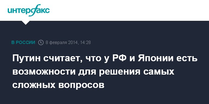 Москва. 8 февраля. INTERFAX.RU - Уровень взаимоотношений с Японией создает предпосылки для решения самых сложных межгосударственных вопросов, заявил президент РФ Владимир Путин.