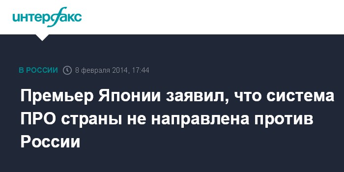 Москва. 8 февраля. INTERFAX.RU - Система ПРО Японии не направлена против России, заявил премьер-министр Синдзо Абэ, отвечая на вопрос "Интерфакса". "Я должен ясно сказать как премьер-министр, что система ПРО Японии не предназначена для использования в отношении России", - сказал он в субботу на пресс-конференции в Сочи.