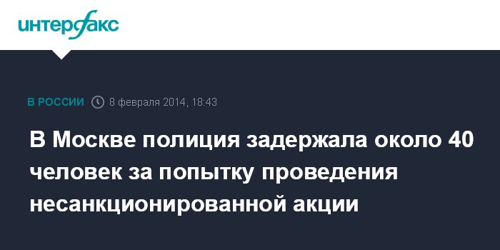 Москва. 8 февраля. INTERFAX.RU - Около 40 человек попали в отделы полиции за попытку проведения несанкционированной акции в центре столицы, сообщили "Интерфаксу" в пресс-службе ГУ МВД России по Москве.