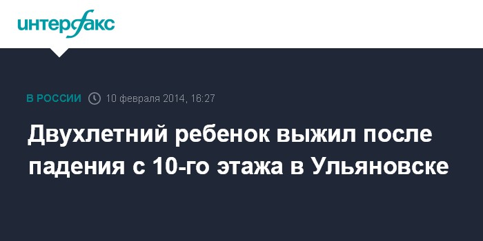 Москва. 10 февраля. INTERFAX.RU - Ребенок доставлен в реанимацию после падения с 10-го этажа одного из домов в Засвияжском районе Ульяновска, сообщила "Интерфаксу" пресс-секретарь городского УМВД Ольга Богатова.