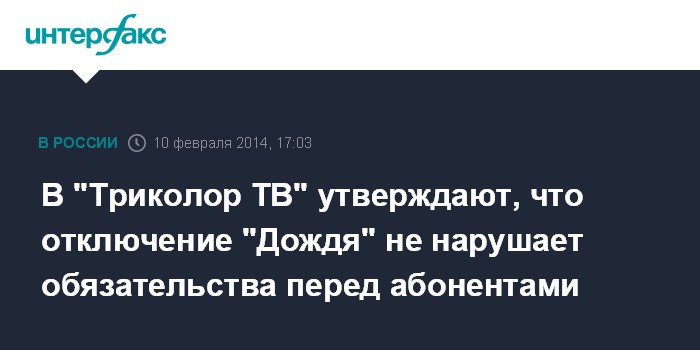 Москва. 10 февраля. INTERFAX.RU - В компании "Триколор ТВ" считают, что отключение телеканала "Дождь" было абсолютно правомерным, поскольку все пользователи пакета каналов были заранее уведомлены.