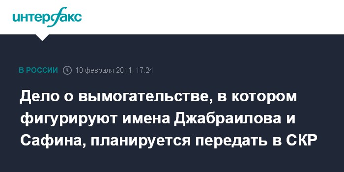 Москва. 10 февраля. INTERFAX.RU - Уголовное дело по факту вымогательства $2 млн, в котором фигурируют имена бизнесмена Умара Джабраилова и сенатора Ралифа Сафина, может быть передано в Следственный комитет.