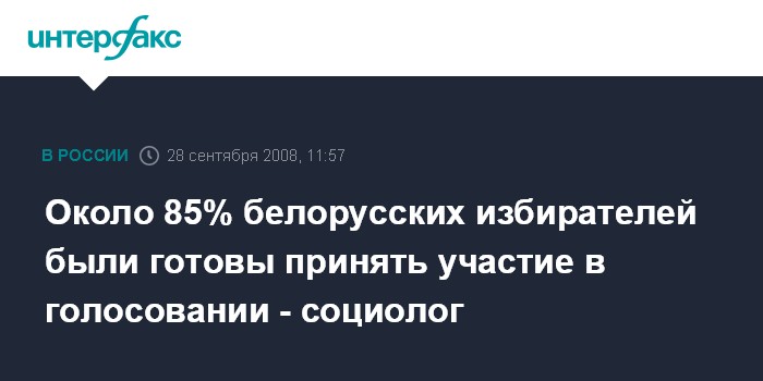 Минск. 28 сентября. INTERFAX.RU - Около 85% взрослого населения Белоруссии готовы принять участие в голосовании в ходе парламентских выборов в Белоруссии, сообщил агентству "Интерфакс-Запад" в воскресенье в Минске начальник управления социологических исследований Информационно-аналитического центра при администрации президента Белоруссии Анатолий Махоркин.