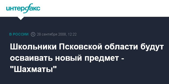 Псков. 28 сентября. INTERFAX.RU - В 100 базовых школах Псковской области с 1 октября появится новая учебная дисциплина "Шахматы", сообщил "Интерфаксу" заместитель директора Псковского областного центра детского и юношеского туризма и экскурсий Hиколай Агафонов.