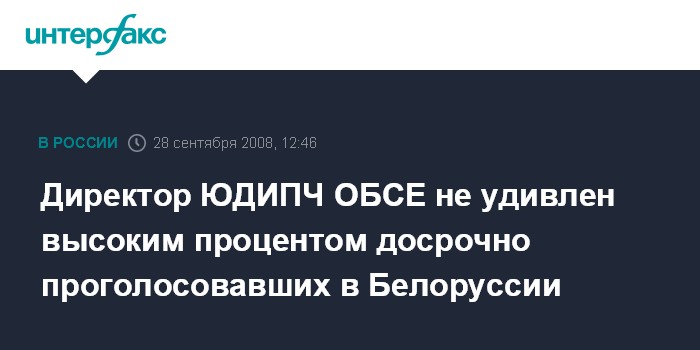 Минск. 28 сентября. INTERFAX.RU - Директор БДИПЧ ОБСЕ Янез Ленарчич не удивлен тем, что досрочно в Белоруссии проголосовало более 26% избирателей.