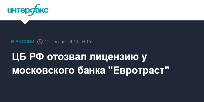ЦБ РФ отозвал лицензию у московского банка "Евротраст"