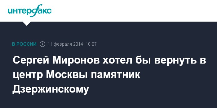 Москва. 11 февраля. INTERFAX.RU - Лидер "Справедливой России" Сергей Миронов высказался за возвращение памятника Феликсу Дзержинскому на Лубянку