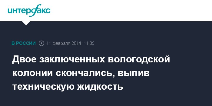 Как сообщает пресс-служба надзорного ведомства, вечером 5 февраля двое осужденных, 1975 и 1982 года рождения, отбывающие наказание в исправительной колонии особого режима № 4 города Сокола, были доставлены в больницу после употребления технической жидкости. Несмотря на проведенное лечение оба скончались в течение суток.