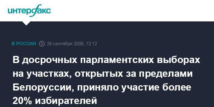 Минск. 28 сентября. INTERFAX.RU - В досрочных парламентских выборах на участках, открытых за пределами Белоруссии, приняло участие более 20% избирателей, сообщила в воскресенье на пресс-конференции в Минске глава Центризбиркома Лидия Ермошина.