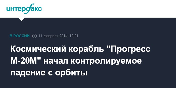 Москва. 11 февраля. INTERFAX.RU - Российский космический транспортный корабль "Прогресс-М20М", на прошлой неделе покинувший причал Международной космической станции (МКС), включил двигательную установку на торможение и начал сход с околоземной орбиты.