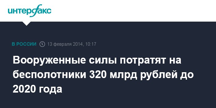 Красноярск. 13 февраля. INTERFAX.RU - На программу оснащения Вооруженных сил России беспилотными летательными аппаратами, рассчитанную до 2020 года, будет израсходовано почти 320 млрд рублей, заявил министр обороны РФ Сергей Шойгу на встрече со студентами Сибирского федерального университета в Красноярске в среду.