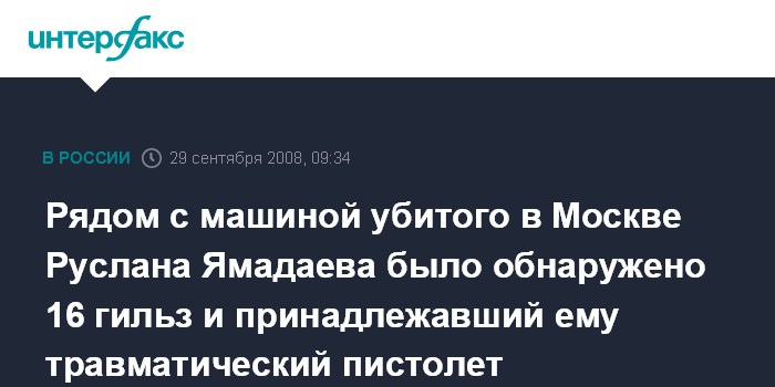 Москва. 29 сентября. INTERFAX.RU - На месте убийства бывшего депутата Госдумы РФ Руслана Ямадаева эксперты обнаружили 16 стреляных гильз калибра 9 мм, сообщил "Интерфаксу" в понедельник источник в правоохранительных органах столицы.