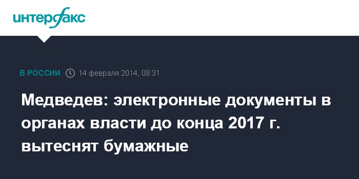Москва. 14 февраля. INTERFAX.RU - Электронные документы в органах исполнительной власти должны до конца 2017 года вытеснить бумажные, которые приобретут статус копий, заявил премьер-министр РФ Дмитрий Медведев на заседании правкомиссии по использованию информационных технологий. Он сообщил, что в пилотном режиме отправку и принятие документов с электронной подписью в настоящее время уже тестируют несколько ведомств, в том числе Минкомсвязи, Минфин, Минэкономразвития и аппарат правительства.