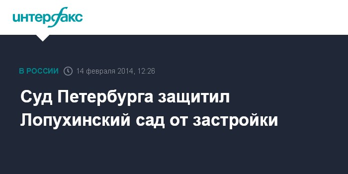 Москва. 14 февраля. INTERFAX.RU - Арбитражный суд Петербурга не удовлетворил претензии ООО "НИС. Жилищное строительство" (RBI), планировавшего построить на территории Лопухинского сада гостиницу, сообщили "Интерфаксу" в инициативной группе градозащитников.