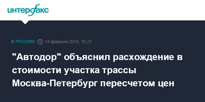 "Автодор" объяснил расхождение в стоимости участка трассы Москва-Петербург пересчетом цен