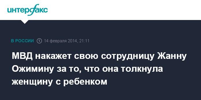 Москва. 14 февраля. INTERFAX.RU - Сотрудница органов внутренних дел Жанна Ожимина, толкнувшая женщину с ребенком, будет привлечена к строгой дисциплинарной ответственности, сообщили "Интерфаксу" в пресс-центре МВД РФ в пятницу.
